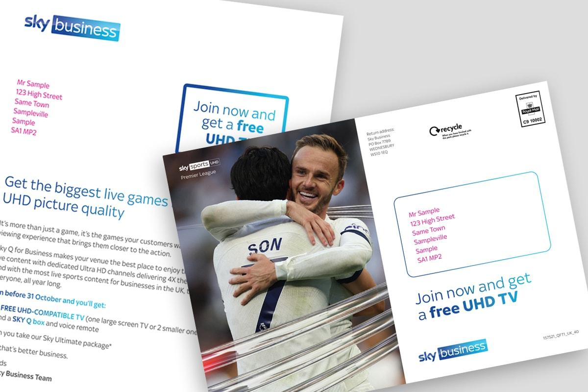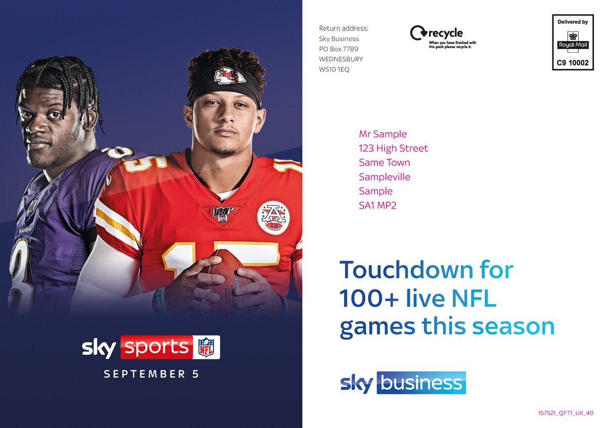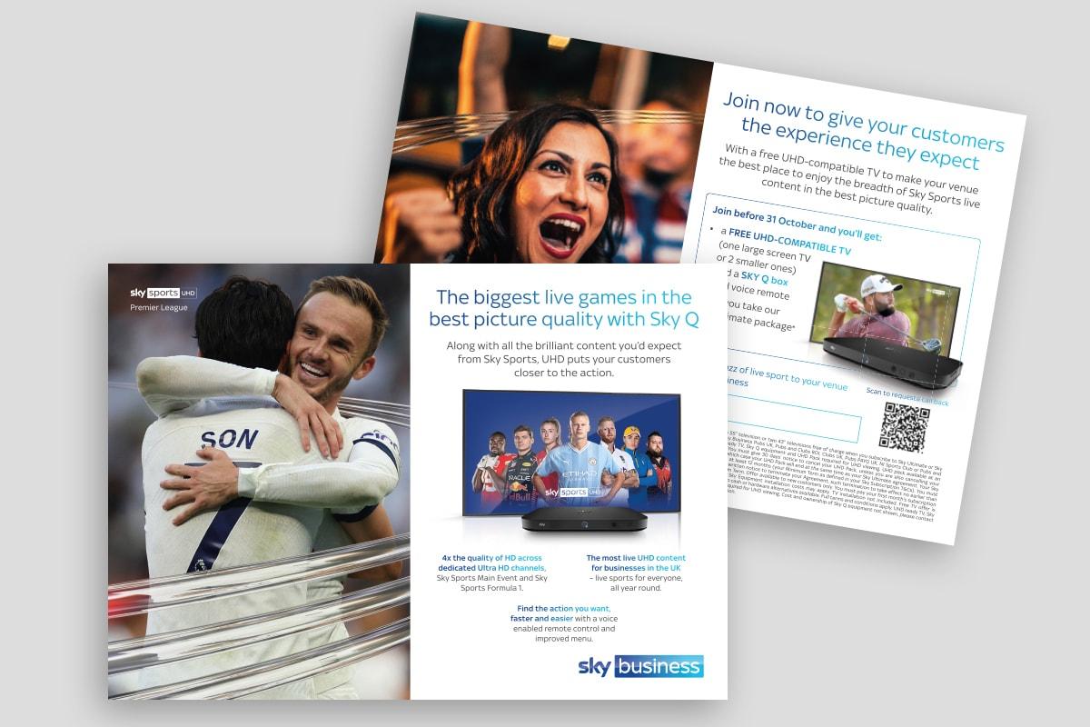 For Sky Business we have designed and produced printed direct mail campaigns to promote the launch of UHD TV in pubs, to promote Sky Packages in Gyms, Restaurants and Care Homes, and to promote NFL coverage on Sky Sports+ for Sky Sports.